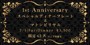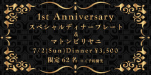 1周年記念イベント / イベント / イベント一覧 7/1(土)【1st Anniversary ディナー】スペシャルディナープレート&マトンビリヤニ 7/1(土) 18:00~20:00のご都合の良い時間にお越 …