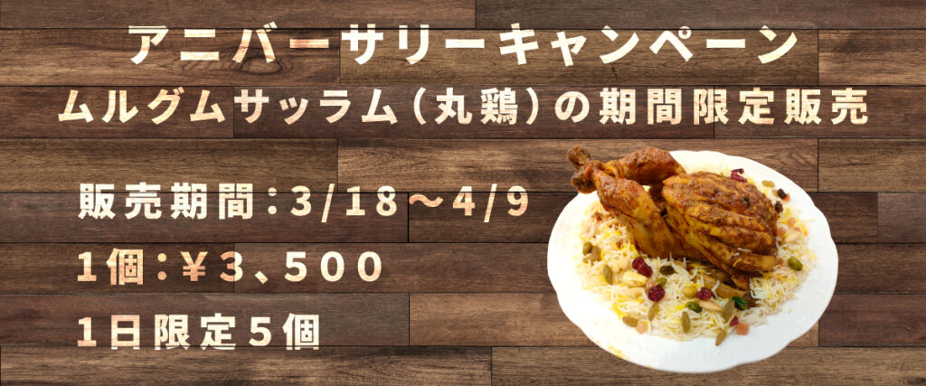 3/18〜4/9までの期間限定で、ムルグムサッラ厶(丸鶏)を1日限定5個で販売いたします。