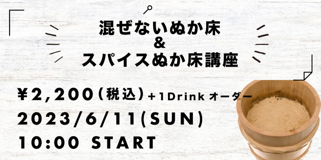- お持ち帰り:スターターぬか床・ぬか床小冊子・ぬか漬け試食付き